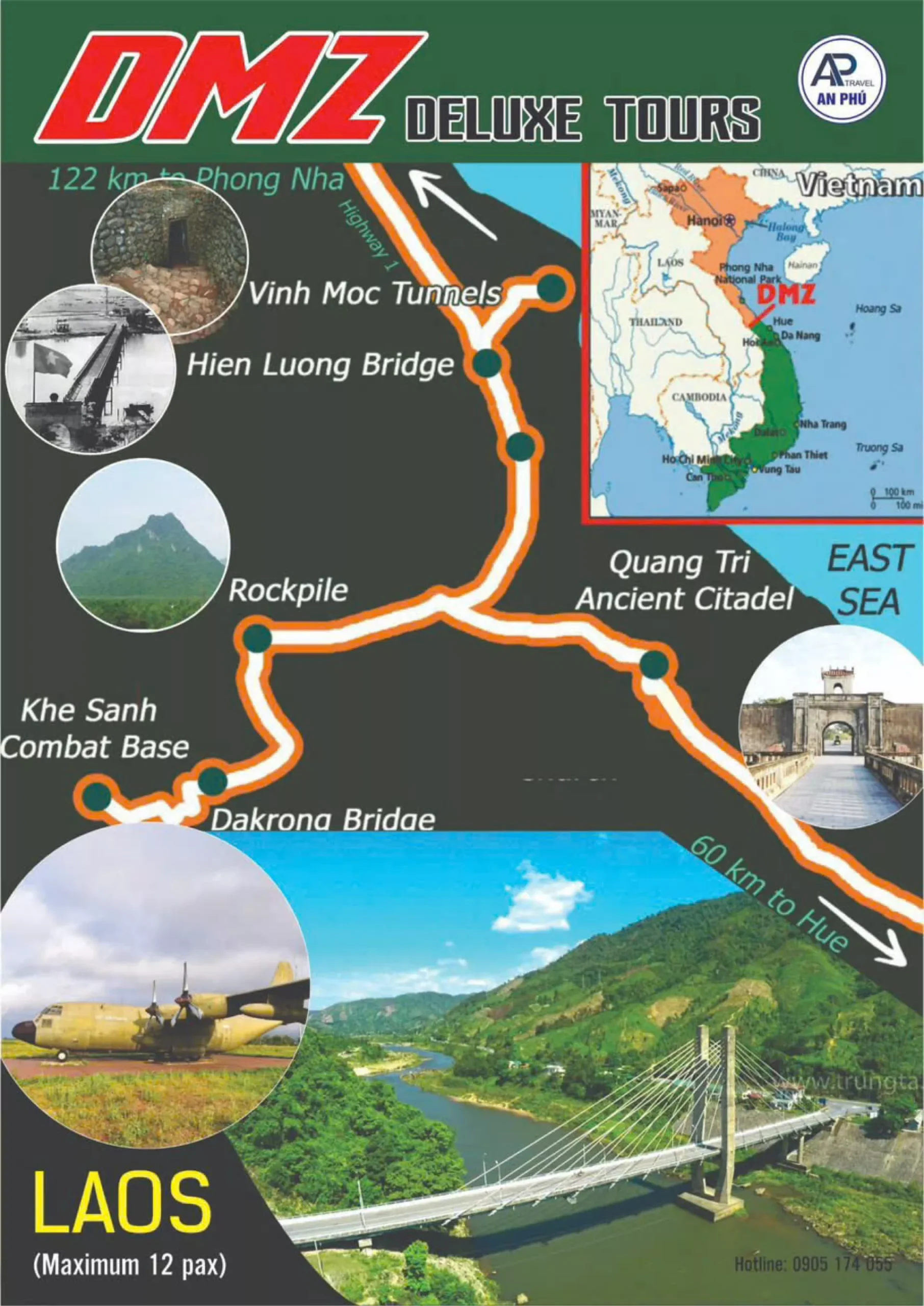Tour DMZ Huế là một chuyến đi trong ngày đầy ấn tượng, đưa bạn quay ngược thời gian thăm lại những di tích lịch sử còn sót lại từ chiến tranh Việt Nam. Khu phi quân sự DMZ Việt Nam từng là vùng đệm an toàn giữa miền Bắc cộng sản và miền Nam tự do từ năm 1954 đến 1975. Nằm tại tỉnh Quảng Trị, miền Trung Việt Nam, vĩ tuyến 17 là nơi đã diễn ra những trận chiến khốc liệt nhất lịch sử, bất chấp cái tên "phi quân sự". Chuyến DMZ Deluxe Tour từ Huế của chúng tôi sẽ đưa bạn bước vào quá khứ, chứng kiến cảnh tượng của nhiều nền móng bị tàn phá. Những đài tưởng niệm anh hùng chiến tranh địa phương, và hàng trăm hiện vật được trưng bày tại một căn cứ Mỹ nay đã trở thành bảo tàng.